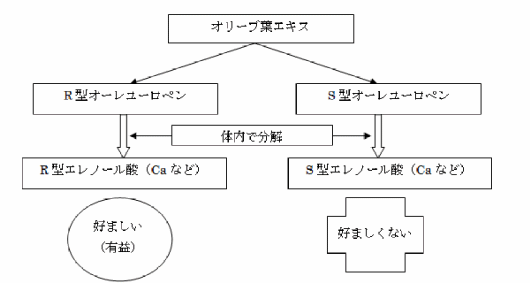 下図のようにオリーブ葉エキスには、R型オーレユーロペンとS型オーレユーロペンがあります。オーレユーロペンは、体内で酵素による加水分解を受けて、エレノール酸になります。R型オーレユーロペンからは、R型エレノール酸ができます。S型オーレユーロペンからは、S型エレノール酸ができます。